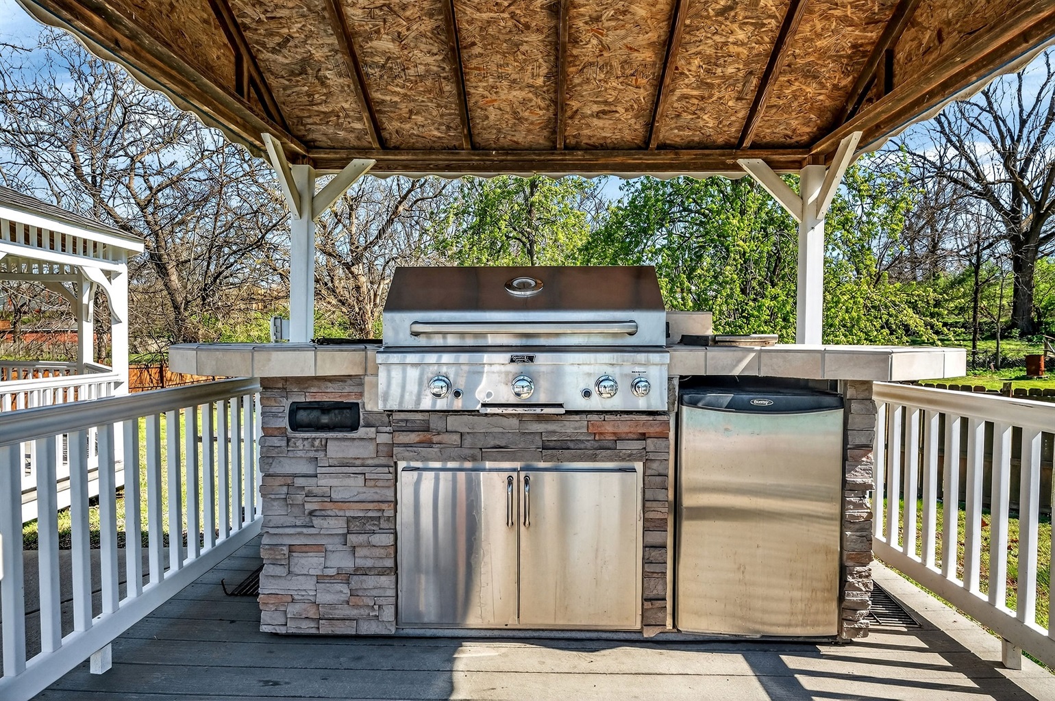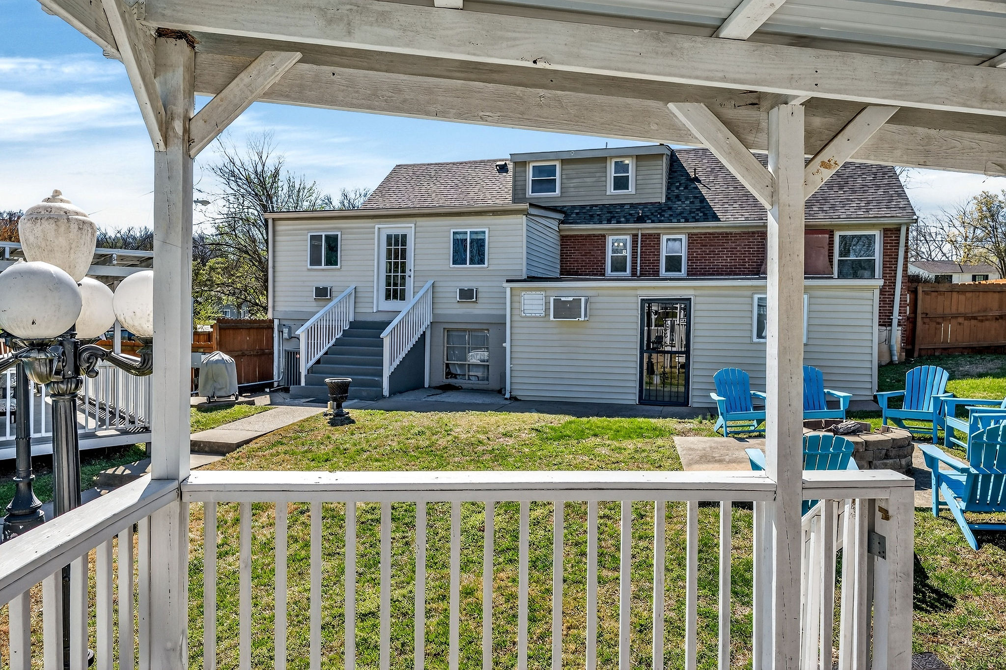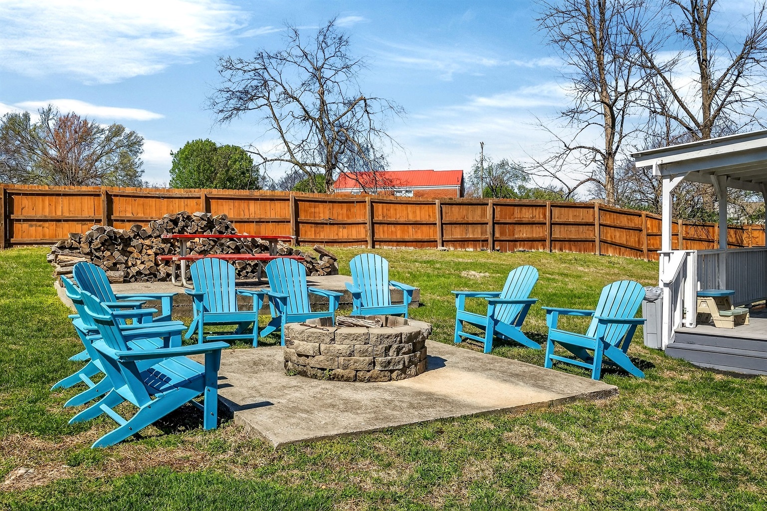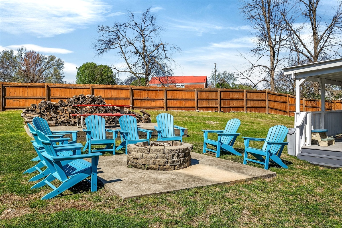 Spacious fenced yard with a fire pit and multiple grills